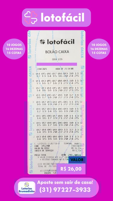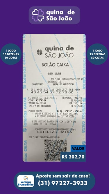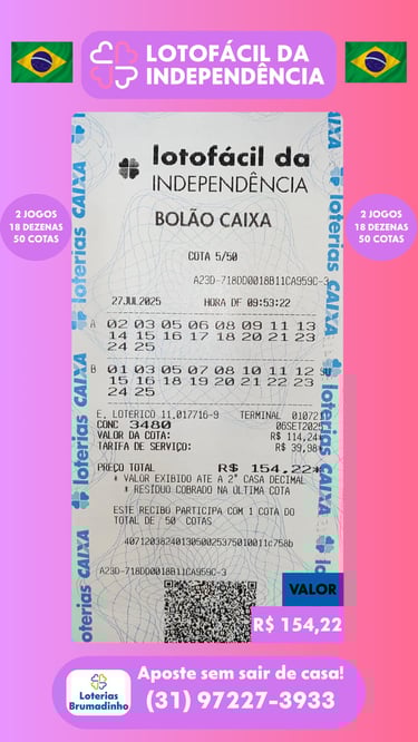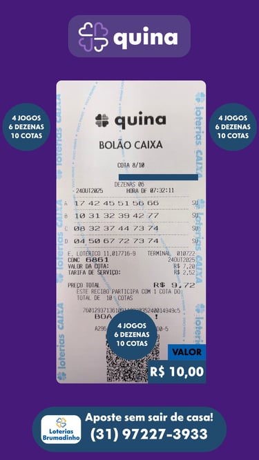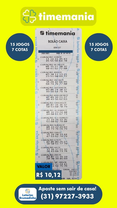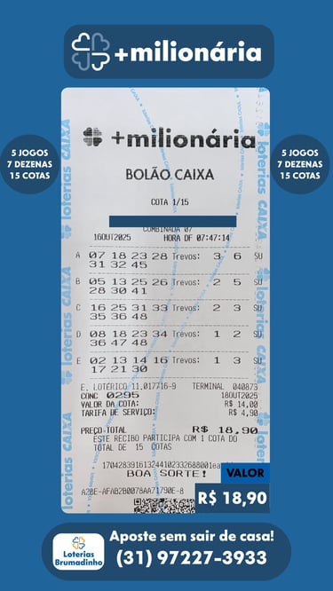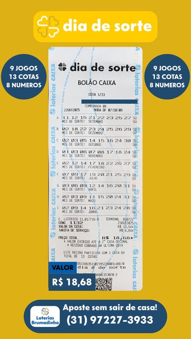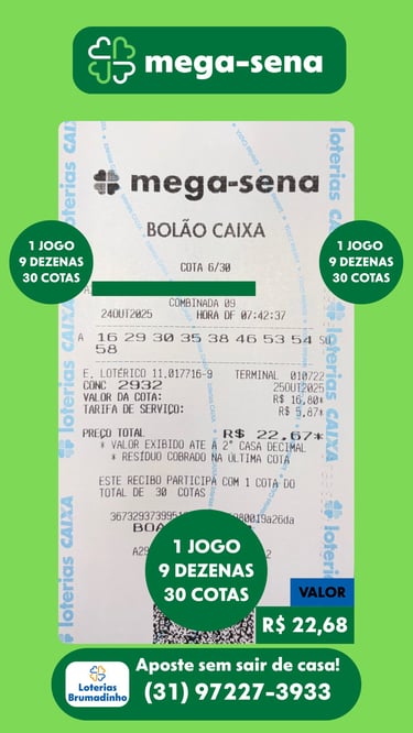 Somos a Loterias Brumadinho, uma empresa credenciada pela Caixa Econômica Federal, comprometida em levar sorte, transparência e confiança a cada apostador.